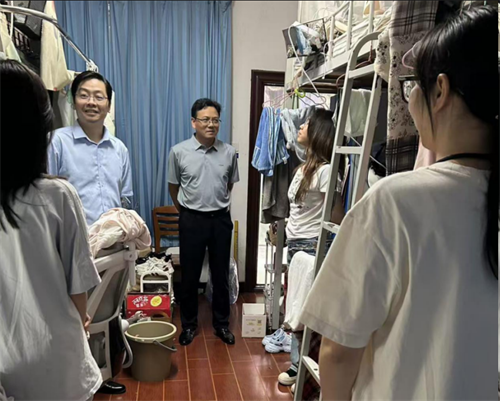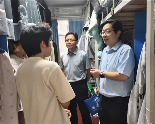 2025年9月18日,南华大学衡阳医学院党委书记曾国来到我院实地走访慰问正在此处开展实习、见习的学生,深入宿舍查看住宿环境,与学生亲切交谈,详细了解其学习生活状况及对教学考试改革的适应情况。南华大学附属长沙中心医院临床学院副院长赵飞骏、科教部主任杨芬及总务部蔡辉老师陪同走访。