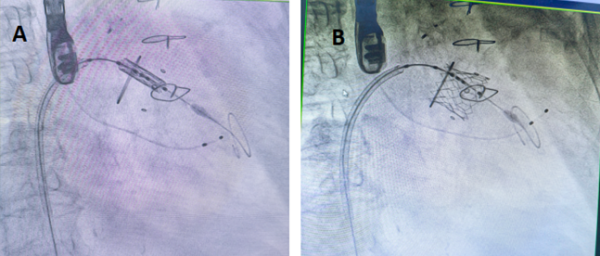 手术过程:A.瓣膜定位;B.瓣膜释放;