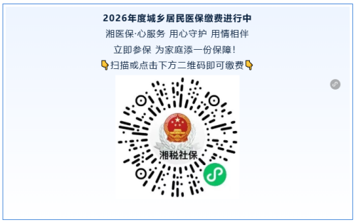 互助共济是中华民族的传统美德。我省2026年度城乡居民基本医疗保险参保缴费工作已正式启动。我们诚挚希望广大城乡居民朋友在2026年1月31日前的集中缴费期内,积极参保缴费。请大家关注本地医保、税务部门的相关通知,通过“湘税社保”微信小程序或APP进行线上缴费,也可以通过银行柜台等进行线下缴费。如果您在参保过程中遇到困难或问题,您就近的乡镇、村(社区)医保站(点)工作人员会为您提供帮代办服务。居民朋友们,让我们携手前行,用实际行动承担起社会责任,共同守护家庭安康。为构建“依法参保、覆盖全民”的中国特色基本医疗保障制度贡献力量,共同守护我们的健康平安!