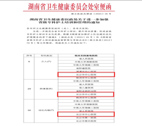 近日,湖南省卫生健康委医政处发布了“关于进一步加强省级专科护士培训和管理的通知”,长沙市中心医院成功获批肺康复、介入、消化内镜三个省级专科护士临床实践基地,标志着我院专科护理培训体系再添新翼,也将持续为市民带来更专业、更安全的优质护理服务。