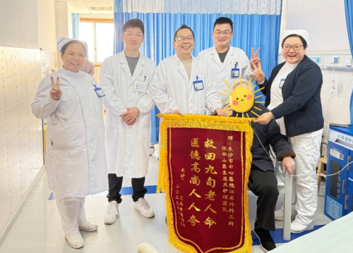 元旦临近,人们沉浸在迎接新年的喜悦中,长沙市中心医院(南华大学附属长沙中心医院)泌尿外科二区的医护人员也收到了一份特殊“新年礼物”——一面饱含深情的、印有“救回九旬老人命,医德高尚人人夸”金色大字的锦旗,不仅见证了医护人员与死神赛跑的英勇,更凝聚了患者家属最深的感激,成为2026年最暖心的注脚。