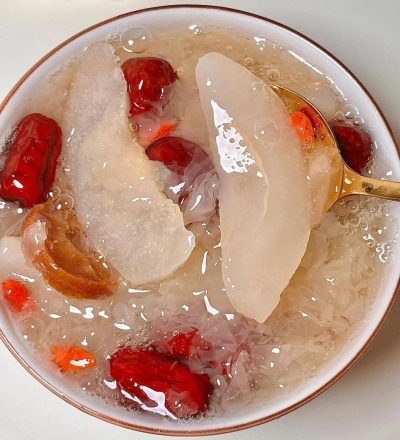 做法:银耳冷水泡发撕小朵,梨去皮核切丁,红枣去核,同入砂锅加水1升,大火煮沸转小火30分钟,加冰糖再煮5分钟,出锅撒枸杞。