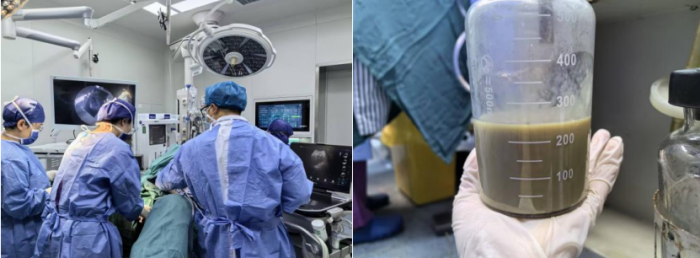 在血糖控制稳定后,黄佼主任团队为患者实施了彩超引导下的阴道内镜下宫颈管粘连分离及脓液引流术,术中发现患者阴道萎缩环状缩窄明显、宫颈管严重粘连,内镜下分离粘连后发现宫腔内积聚大量黄绿色、带有腥臭味的脓液。经过精心操作,成功引流出脓液约250ml。术后患者神志逐渐清醒,血压回升,血糖稳定,感染指标明显下降。