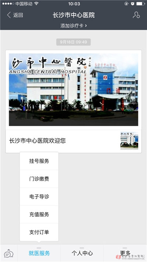 2015年10月8日,长沙市中心医院手机APP应用正式上线。患者今后可以随时随地使用手机办理挂号、查询等业务。