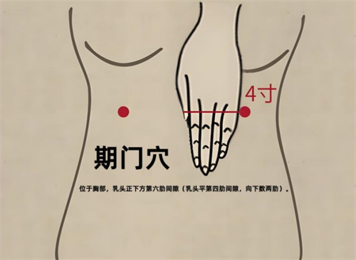 2.期门穴:位于胸部,乳头正下方第六肋间隙(乳头平第四肋间隙,向下数两肋)。胸闷胁胀?每天顺时针揉50下,帮肝气“疏通管道”。