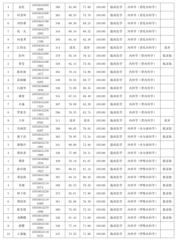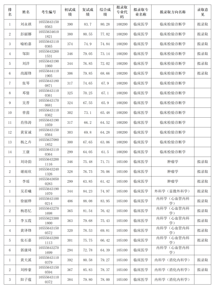 根据《南华大学2026年硕士研究生招生复试录取工作方案》、《南华大学附属长沙中心医院2026年硕士研究生复试录取工作方案》,经南华大学附属长沙中心医院研究生招生工作领导小组审核,现将2026年硕士研究生一志愿拟录取名单予以公示,公示期为2026年4月1日-11日,如对复试结果有异议,请联系内部监督审计部,联系电话:0731-85668104。